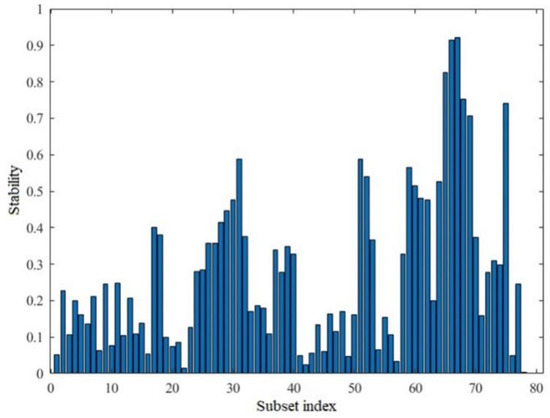 UVE algorithms are used for feature selection before modeling [25]. MC combined with UVE is designed to randomly split the original training data set into sub-data sets using MC algorithms and to implement the UVE–PLS model in the sub-dataset [25,26]. If the correlation coefficient matrix of spectral data is , then stability can be judged by Equation (8):