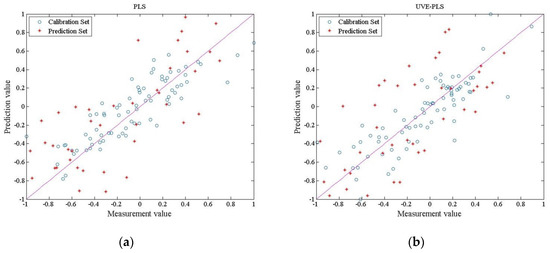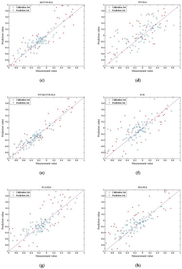 The differences in calibration model accuracy among the PLS, UVE–PLS, MCUVE–PLS, WT–PLS, WT–MCUVE–PLS, principal component regression (PCR), PCA–PLS, and SPA–PLS models are shown in Table 4 and Figure 7. The performance of the PLS model was worse than that of the MCUVE–PLS model. The implementation of the WT–MCUVE–PLS was better than that of the MCUVE–PLS model. The RMSECV and RMSEP of the PLS, MCUVE–PLS, and WT–MCUVE–PLS models were 0.0407, 0.1396, and 0.0449, 0.1556, and 0.0098, 0.0390, respectively. The WT–MCUVE–PLS model had the highest in the calibration and prediction sets of 0.9485 and 0.9369, respectively. It can be seen that the model has better accuracy and correlation when the input data undergoes the synergy of preprocessing and feature selection. By comparing the output of , it can be seen that the performance of the WT–PLS model was worse than that of the UVE–PLS model. The RMSECV and RMSEP of the two models were 0.0808 and 0.1491, and 0.0159 and 0.0875, respectively. Since the input data of the UVE–PLS model was not pretreated and the number of features was reduced, the of its calibration and prediction sets was the second highest of all the models, and the distribution of data points in Figure 7 can be explained. The input matrix features of the eight models were 511, 100, 70, 154, 70, 511, 80, and 50 (Table 4). After a grid-search was used for global optimization, the MCUVE–PLS model had the best quality when the feature number of the MCUVE output matrix was 70. To achieve the best results, the feature number of the input matrix of WT–PLS was reduced to 154 by WT. Under the joint action of WT and MCUVE, the final feature number of the input matrix of WT–MCUVE–PLS was 70. The model performance gradually increased according to the decrease in input matrix features. Therefore, choosing a more efficient data compression scheme can significantly improve model performance. Of the above schemes, WT–MCUVE–PLS was the best model for predicting performance. In comparison with the other methods, the regression effect of PCR and SPA–PLS was good, but there was a certain gap compared with WT–MCUVE–PLS. PCA–PLS had a poor regression effect because of the limited amount of information carried after dimension reduction.