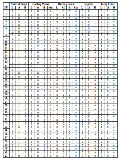 For instance, the control temperature has been quantized into high, medium and low ranges. So, a TU for any given time interval, could either be in a low control temperature, medium control temperature or a high control temperature state. Similarly, the set point and temperature error has been quantized into high, medium and low ranges. For cooling and heating power, the data variables are divided into low, medium and high ranges. Additionally, there is a possibility that some of the TUs use maximum heating or cooling power. To accommodate this additional state exhibited by the TUs, maximum heating and maximum cooling power has been considered as a separate discrete range.