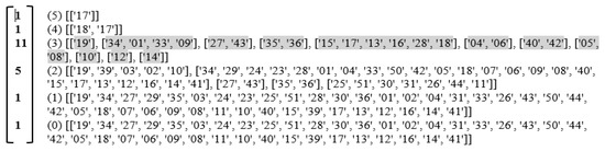 The q–connectivity lists and corresponding TU Q-vector. The left-hand column is the TU Q-vector i.e., number of components at each q-level, the number in the parentheses indicates the q-level, the square brackets indicate the connected components.