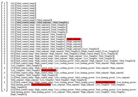 The q–connectivity list and corresponding state Q-vector. The left-hand column is the state Q-vector, the number in the parentheses indicates the q-level, the square brackets indicate the connected components. The highest q-value (30) shows for this time interval 31 TUs were in state medium control temperature, although only 24 TUs had medium set point (q = 23), while 16 TUs had a high set point (q = 15). A total of 12 TUs had low temperature error, while 5 TUs had high temperature error, 2 TUs were at maximum cooling power and maximum heating power. Using the incidence matrix as shown in Figure 5, it is possible to drill down to see which TUs are exhibiting anomalous behavior in an automated manner.