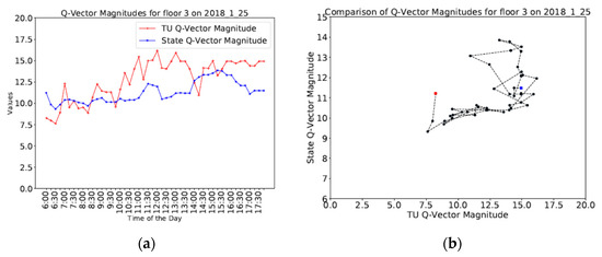 Different data visualizations are carried out for the TU and state Q-vector magnitudes for TUs belonging to a single building floor and are shown in Figure 9a,b. In Figure 9a, the TU and state Q-vector magnitudes are plotted to identify the temporal behavior during a single day, but the distinct phases are less clear, while in Figure 9b the scatterplot of the TU and state Q-vectors is shown. The comparison of many such plots show distinct phases of behavior, but the temporal aspects are lost. Nevertheless, some of the temporal aspects can still be captured by adding a line plot to the scatterplot showing the movement from one time instant to another and distinguishing the start and finish endpoints (red and blue squares respectively).
