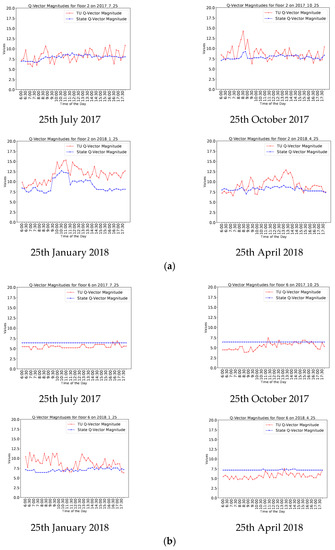 Figure 11 shows the three different behaviors exhibited by different floors on a summer day. It is seen in Figure 11a that floor 4 has a stable behavior with almost no variation in state Q-vector magnitude and very little variation in TU Q-vector magnitude; while in Figure 11b, floor 11 shows mild dynamic behavior with little variation in state Q-vector magnitude in addition to slightly more variation in TU Q-vector magnitude. Figure 11c shows dynamic behavior displayed by floor 15 with higher variation in both TU and state Q-vector magnitude. Similarly, Figure 12 shows stable behavior for floor 4, mild dynamic behavior for floor 11 and dynamic behavior for floor 9 on a winter day.