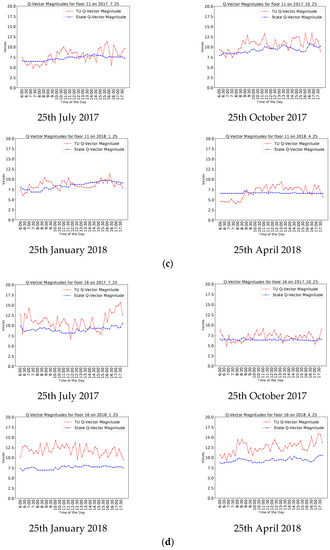 Graphs depicting the variation of TU Q-vector magnitudes and state Q-vector magnitudes on four different days across different seasons for (a) Floor 2 (b) Floor 6 (c) Floor 11 (d) Floor 16.