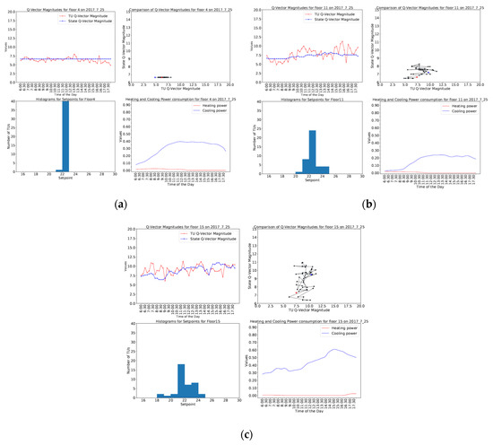 Graphs depicting the variation of TU Q-vector magnitudes and state Q-vector magnitudes, Scatterplot of TU and state Q-vector magnitudes, Set point histogram, Heating and cooling power consumption for different behaviors on (a) Floor 4 (b) Floor 11 (c) Floor 15 on 2017.7.25 (summer day).