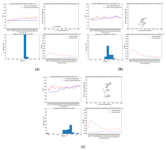 Graphs depicting the variation of TU Q-vector magnitudes and state Q-vector magnitudes, Scatterplot of TU and state Q-vector magnitudes, Set point histogram, Heating and cooling power consumption for different behaviors on (a) Floor 4 (b) Floor 11 (c) Floor 9 on 2018.1.25 (winter day).
