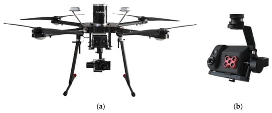 For the research work presented in this paper, which started almost two years ago and which was funded by the Apulia Region, a medium-sized multirotor UAV (Italdron 4HSE EVO, Figure 1a) with a maximum payload of 2.5 kg was used. It was equipped with a purposely developed payload comprising a 3D gimbal with a compact five band multispectral camera (MicaSense RedEdge-M [61]), a high-resolution thermal camera (FLIR Vue Pro 640 [62,63]), and a high-resolution visible camera (Sony α7r) (Figure 1b).