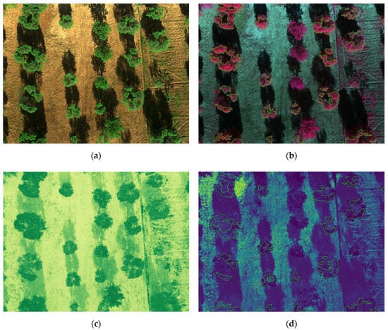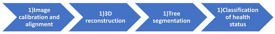 Tree segmentation was performed according to the algorithm outlined in Figure 7, which is detailed below. Its purpose was to separate trees from soil and apply health status classification to trees only. The algorithm was composed of many steps because differentiating trees and their irregular contours from soil or even from soil covered with grass proved to be a difficult task.