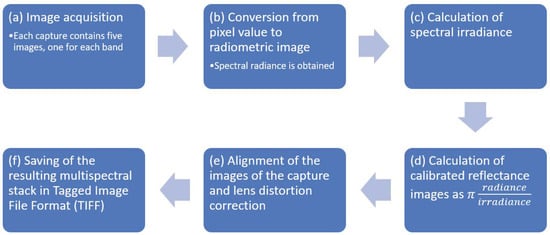 The five images grabbed from the multispectral sensor were calibrated and aligned as discussed below to obtain a proper multispectral reflectance stack, following the procedure recommended by the manufacturer [70]. The processing steps are summarized in Figure 6 and described below.