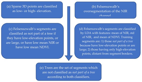 Afterwards, two different classification methods, in steps (c) and (d), are applied to Felsenszwalb’s segments, and their results are combined in step (e). Let and be the classification results for the segment according to the first and second method, respectively, and let be the final classification into class (“not part of a tree”) or class (“part of a tree”). We used, for example, notation to say that segment has been classified as not part of a tree.