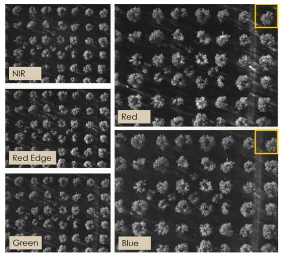 - Reflectance images were corrected for lens distortion using parameters provided by the manufacturer, namely three-element radial distortion and two-element tangential distortion correction parameters. After distortion correction, the five images were aligned by correcting the different points of view of each sensor. For this purpose, the image in the green band was (arbitrarily) selected as a reference, and the other four images were aligned by calculating, for each of them, an eight-parameter homography that maximized the enhanced correlation coefficient (ECC) [71] with the reference. The parameters were obtained using the findTransformECC function of the OpenCV library [72]. Since estimating the parameters of the four homographies was time-consuming, they were calculated for a capture in the middle of the flight and their inverse functions were applied to align the other captures; this procedure was correct because all of them were taken at the same distance from the ground, and at a distance which was greater than the change of depth of the subjects (trees and ground); hence, the images could be aligned in the same way.