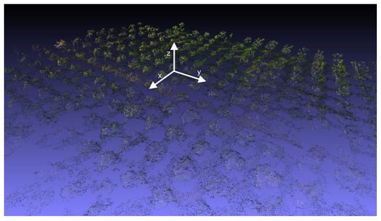 The same observation made for Figure 14c, that NDVI does not differentiate trees from grass, also motivated the approach used for tree segmentation. Indeed, the algorithm proposed in this paper takes into account several parameters, not only spectral ones but also points’ elevation, to accomplish the segmentation task in a robust way. However, it should be stressed that the elevation of points was obtained using photogrammetry on images shot with the multispectral sensor. In contrast, sensors such as LiDAR (light detection and ranging) can be used to ensure higher reconstruction accuracy and high point density, with good performance in the precise determination of canopy geometry, as was analyzed in Reference [79]. In our work, the precise analysis of canopy geometry was unnecessary and the obtained sparse 3D reconstruction, even if more prone to errors than LiDAR, nonetheless permitted identification of all trees thanks to our purposely developed segmentation algorithm.