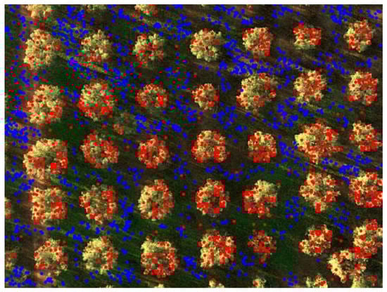 As previously stated, a few non-olive trees were discarded from processing in Figure 13. That exclusion was performed manually. Automatic methods for tree species recognition have been proposed in the literature; LiDAR data together with geometric models were used to distinguish among five species in forest plots in Finland with a classification accuracy above 93% [80]. However, such a technique was not applied in our work in order to relax hardware requirements. In Reference [81], it was shown that shape, texture, and color analysis of airborne winter imagery taken with a pocket camera could discriminate between three boreal forest species with 82% accuracy. Even if tree segmentation was facilitated by snow on the ground in that study, it is foreseen that this class of techniques may be exploited to complement the method proposed in this paper, which does not suffer from background discrimination, in order to automatically select olive trees.