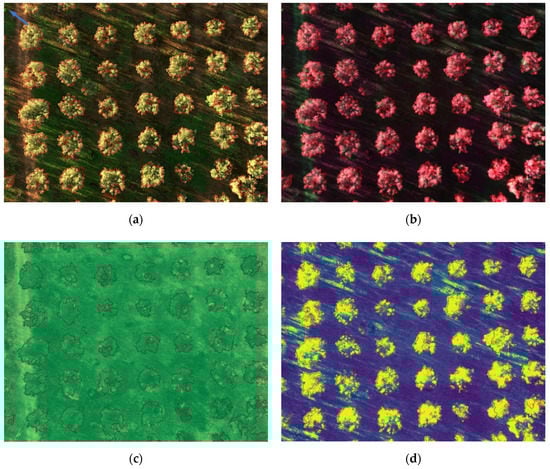 - Squinzano (LE), 40°27′35.79″ N, 18° 7′2.69″ E, time 14:30 UTC, with olive trees with symptoms of Xf, with a planting layout of about 8 m × 8 m and an age of about 50 years. Sun elevation and azimuth were 33° and 255°, respectively.