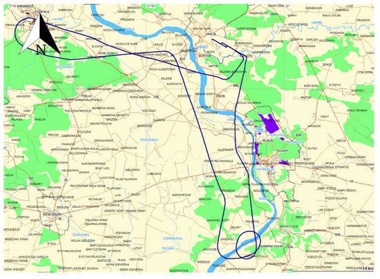 The flight route of the Cessna 172 passed over the following locations: Dęblin–Kozienice–Kazimierz Dolny–Puławy–Dęblin. The flight test lasted from 09:39:03 to 10:35:03 according to GPST (GPS time). Figure 1 shows the trajectory of the Cessna 172 aircraft in the horizontal plane. It should be noted that for the results presented in the paper, the weighted average model was used for the speed range from 0 to 80 m/s [28].