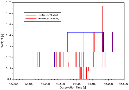 The weight value for Case II: Thales (blue) and Topcon (red).