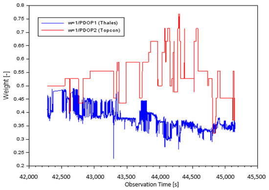 Figure 3 presents the measurement weights as a function of PDOP value separately for the Thales Mobile Mapper (blue) and Topcon HiPerPro (red) receivers. The values of the measurement weights for Case II, depending on PDOP value, for Equation (5), for parameter (based on Thales receiver) was from 0.228 to 0.490. Moreover, the mean value of measurement weight was equal to 0.375 and the median was 0.372. The values of the measurement weights for parameter (based on Topcon receiver) were from 0.323 to 0.769. The mean value of the measurement weight was equal to 0.538 and the median was 0.526.