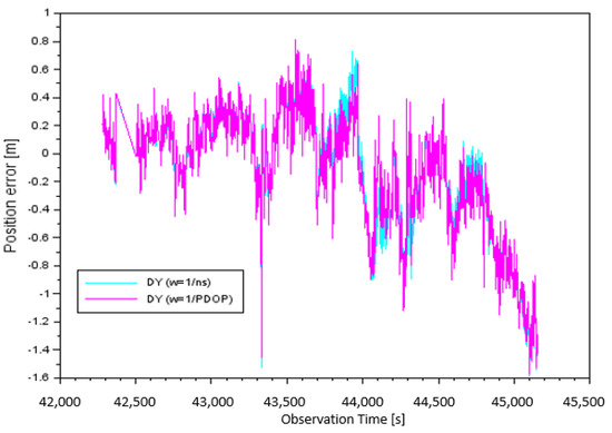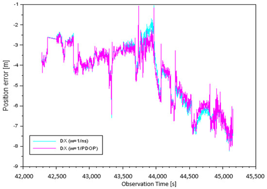 Figure 6 illustrates the results of the component of position errors taking into account the individual measurement weights. The error values of for parameter , depending on the number of satellites tracked, were from −4.06 m to +0.33 m. It should be noted that the arithmetic mean for parameter was equal to −1.85 m. The error values of for the parameter , depending on PDOP, were from −4.12 m to +0.09 m. It is worth mentioning that in this case, the arithmetic mean of the component was equal to −2.12 m.