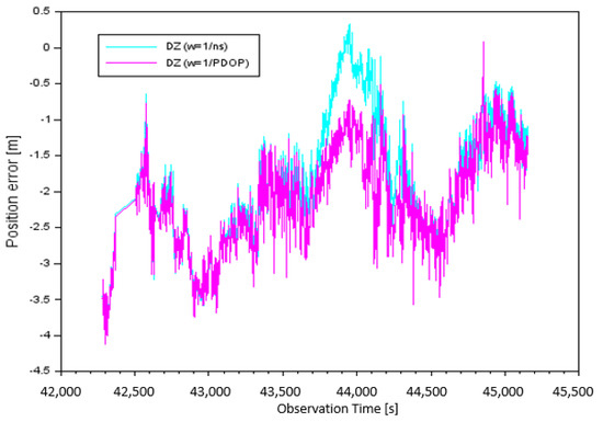 When comparing the RMS values in Figure 9, one can see that the errors obtained from the presented method were smaller than the position solution from a single GPS receiver. Therefore, the accuracy of the position determination for the Z component of the proposed method was better than that of the position solution from a single GPS receiver. Table 4 shows the percentage changes in the increase in RMS accuracy for the developed methodology along the Z-axis. The percentage change of RMS accuracy change for the presented methodology is given according to the mathematical relation as below: