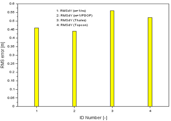 The results of the RMS parameters along the Y-axis are shown in Table 1, while Figure 8 shows the results of the proposed measurement weights solution (numbers 1 and 2) along the Y-axis, and additionally the RMS error results for the SPP solution for single Thales and Topcon GPS receivers as sequence numbers 3 and 4, respectively. For the Thales Mobile Mapper receiver, the RMS accuracy was 0.56 m, while for the Topcon HiPerPro receiver it was 0.52 m.