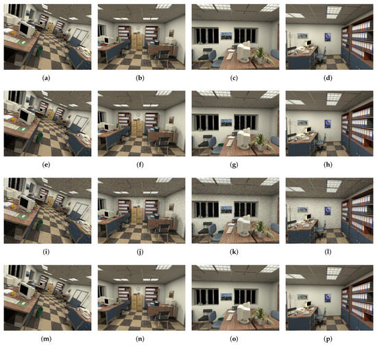 Noise dataset overview. (a–d) Clean images; (e–h) Medium noisy images with noise Medium noise intensity , ; (i–l) High noisy images with noise Medium noise intensity , ; (m–p) Denoised images for Medium noisy images.