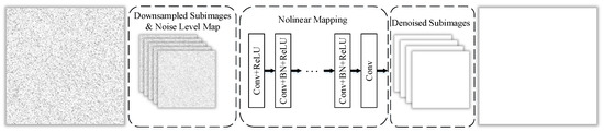 As shown in Figure 2, the input tensor is then fed into a series of 3 × 3 convolutional layers, each of which contains the following three operations—Conv, ReLU (rectified linear unit), and BN (Batch Normalization) [38]. Specifically, the first layer uses Conv + ReLU, the middle is Conv + BN + ReLU, and the last convolution layer is Conv. After each convolution, zero padding is used to ensure that the size of the feature map does not change. After CNN, the upscaling operation is used as the reverse process of the downsampling process in the input stage to generate a denoised image with the same size as the original input image.