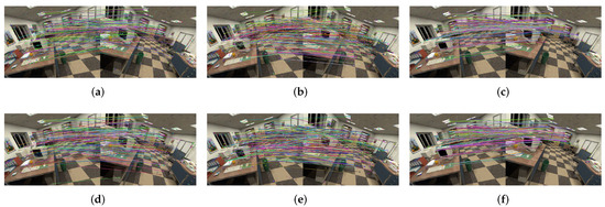 Feature matching overview. (a–c) Feature matching by SIFT, SURF, and ORB of the noisy images; (d–f) feature matching by SIFT, SURF and ORB of the denoised images.