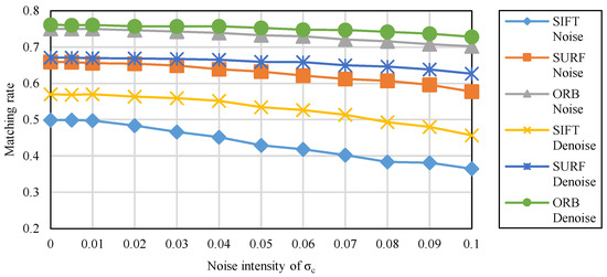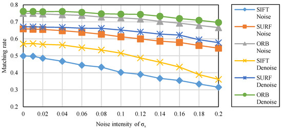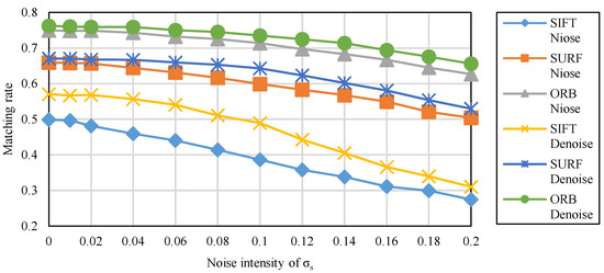 The results of irradiance-independent Gaussian noise are shown in Figure 4. It can be seen that the matching rate of ORB is the highest of the three, while SURF is second and SIFT is the lowest.
