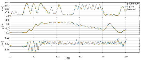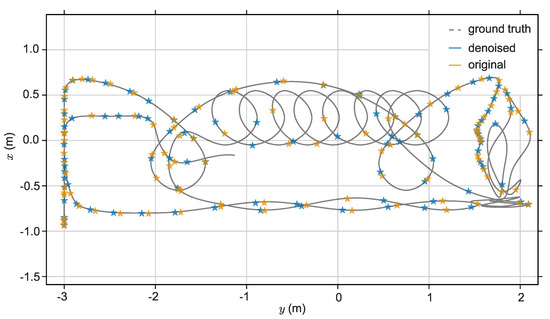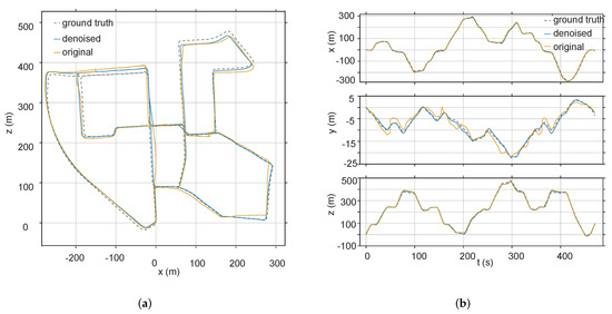 The evo tools [39] are used to plot the figures of the estimated trajectories and the two trajectories with the RMSE closest to the average are selected for plotting. A visual comparison of the original and denoised sequence of the estimated trajectories are shown in Figure 8. The comparison on each axis of the clean sequence and denoised clean sequence is shown in Figure 9. Although the difference between the two is small, it can be seen from the z-axis that the denoised clean sequence error is smaller than the original clean sequence. The statistical results of Table 5 show that for the denoised sequences, the maximum of ATE decreased by 10.68%, the mean of ATE decreased by 17.23%, the median of ATE decreased by 19.55%, the minimum of ATE decreased by 6.35%, and the RMSE of ATE decreased by 16.75%.