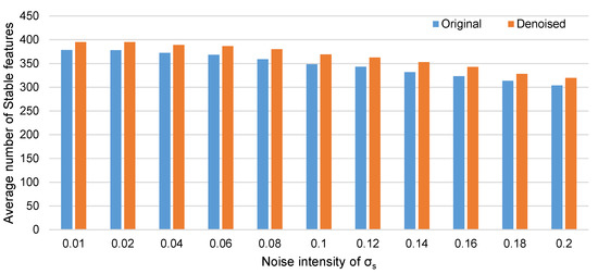 When the images to be co-registered, the noise in images often have different type and level. To study whether the denoised sequence has more stable features when the noise intensity is different, the original image and the denoised image in the clean sequence are used as a reference, and then images with different noise levels are performed image matching with the reference image respectively. The number of stable features is shown in Figure 12. It is shown that the denoised images have more stable features than the original. To some extent, it can be said that the denoising will be helpful when the image co-registration at different noise levels.