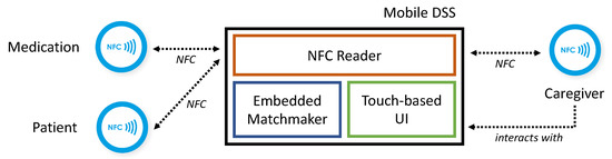 Both NFC and RFID AutoID technologies could be adopted theoretically in the proposed DSS. NFC has been preferred by virtue of its ability to protect sensitive healthcare information from eavesdropping and man-in-the-middle attacks—due to short radio range—and to support bidirectional interactions [9]. Furthermore, NFC technology is universally standardized at the 13.56 MHz UHF (Ultra-High Frequency) band, while several RFID standards exist for specific classes of use cases, adopting different protocols and frequency bands. This has facilitated the integration of NFC reader functionalities in a significant portion of currently available mobile devices (smartphones, tablets), which are immediately compatible with the proposed DSS. Conversely, RFID reader peripherals or dedicated devices should be purchased to enable the proposed vision. Moreover, all NFC tags are passive, i.e., they need no power source to work: this helps drive costs down with respect to active RFID tags. The framework architecture and HCI workflows have been designed to mitigate the main challenges of NFC, which make it unsuitable to other scenarios: