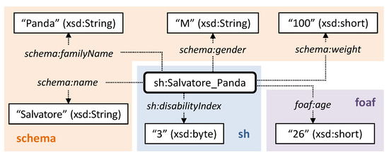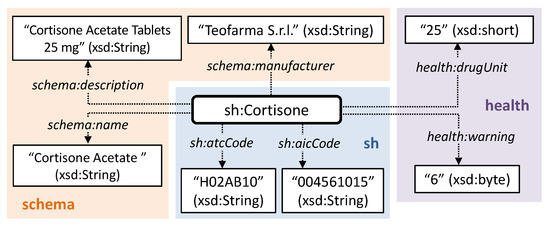 Extra-logical data-oriented attributes are used to integrate and refine the automated reasoning outcomes, in order to take context-aware parameters into account in decision support. They are modeled as OWL annotation properties related to the instances of patients, caregivers and medicines. Also in this case, well-known semantic vocabularies have been exploited. For patients: name, surname, gender and weight are defined through the schema.org vocabulary [62]; age is modeled following the FOAF specification [63]; severity of condition is represented in a scale from 0 to 4, following the WHO ICF framework [44]. Figure 5 shows an example of patient model. As depicted in Figure 6, attributes for pharmaceuticals include: name, manufacturer and generic description defined by schema.org; dosage and frequency of adverse effects using the drugUnit and warning properties of the Health and Lifesciences vocabulary (https://health-lifesci.schema.org/), an extension of schema.org proposed for medical entities; Anatomical Therapeutic Chemical (ATC) identification code, based on the WHO ATC classification system [64]; AIC code (https://www.fascicolosanitario.gov.it/sistemi-codifica-dati/informazioni/aic), an authorization number issued by the Italian Drug Agency (Agenzia Italiana per il Farmaco, AIFA) for verifying the authenticity of a medicine package. The last two attributes refer to specific properties defined in the Smart Health KG as sub-properties of schema:code provided by schema.org. Finally, caregivers’ annotations include name, surname and description in terms of position or task.