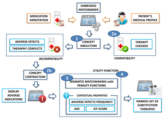 Non-monotonic inference procedures in [55] are leveraged to discover suitable treatments for a given patient’s disease, personalized for the individual medical history. The matchmaking engine [8] embedded in the DSS is able to compute a score based on the semantic consistency between patient’s disease(s) and available medication profiles, in order to: (i) detect possible incompatibilities between a proposed therapy and the patient’s condition; (ii) find out interactions with treatments the patient is already undergoing, which may result in lower therapy effectiveness or health risks; (iii) rank treatment options by appropriateness; (iv) explain the outcomes of matchmaking in all cases.