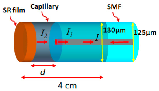 The schematic illustration of the proposed FPI for gas pressure sensing is shown in Figure 1. The FPI comprises of a section of silica capillary (diameter = 130 µm) coated with an SR film by spin coating method, and a section of SMF (diameter = 125 µm) inserted into this silica capillary. The inner surface of the SR film and the tip of SMF act as two reflecting surfaces for the resulting interference pattern.