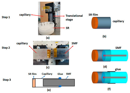 Step by step procedure for the fabrication of the FPI sensor. Step 1: dipping of capillary into the SR solution (a) and schematic of the capillary with SR film at its tip (b). Step 2: experimental set up for insertion of a SMF into the capillary (c) and schematic of the capillary with inserted SMF (d). Step 3: schematic of fixing of capillary with SMF using glue (e) and resulting probe (f), respectively.