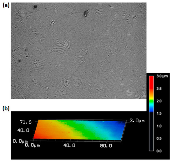 The optical microscopic images of the inner surface of the SR film corresponding to rotational speeds of 4800, 3000, and 5900 rpm are shown in Figure 3a,c,e, respectively. At a rotational speed of 4800 rpm, the inner surface of the SR film appears to have a flat surface which can be verified from the commendable contrast of the corresponding interference pattern shown in Figure 3b. However, at a lower rotational speed of 3000 rpm, the inner surface of the SR film appears to be rough and curved as shown in Figure 3c and the corresponding interference pattern shows a diminished contrast in the reflected power as shown in Figure 3d. It should also be noted that such SR films with rough and curved inner surfaces can also be formed in the absence of the spin coating process. Further increment in the rotational speed complicates the uniform film formation process and hence, at a rotational speed of 5900 rpm, there is no visible film at the tip of the capillary as shown in Figure 3e. Therefore, 4800 rpm was verified as the optimized value of the rotational speed and the corresponding optical microscopic image of the probe is shown in Figure 3f where the thickness of the SR film is 257 µm and the cavity length is 58 µm and this length nearly agrees with that of the theoretical value (63 µm) calculated using Equation (2). Three probes with SR thicknesses of 251, 257, and 258 µm (standard deviation of 3.78 µm) were fabricated using the same optimized rotation speed. The roughness measurement of the SR film surface on the glass slide was also conducted using laser microscope (VK-X200, KEYENCE). The maximum variation in surface roughness of the samples are found to be 3, 3.3, and 2.5 µm with the standard deviation being 0.40 µm. The optical microscopic image of the film as well as roughness measurement for one of the samples is shown in Figure 4.