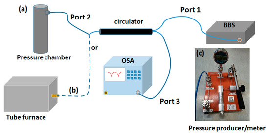 The experimental setup used to detect and analyze the response of the FPI sensor to physical parameters such as applied gas pressure and temperature is displayed in Figure 5. Light from a broadband source (bandwidth of 100 nm) was coupled to one port of a circulator (6015-3-APC, Thorlabs Inc, New jersey, NJ, USA) and the probe was spliced to the second port of the circulator. The reflected light from the probe was collected by the third port connected to the OSA. The sensing probe was placed inside a gas pressure chamber as shown in Figure 5, in an attempt to investigate its pressure response, where the pressure inside the chamber was tuned gradually from 0 to 50 kPa at steps of 5 kPa. The applied pressure was calibrated using a pressure gauge (CONST 211) (see Figure 5b). Similarly, the temperature response of the probe was also explored by placing the sensing probe inside a tube furnace. Additionally, detection of the pressure response time was also carried out with the aid of an interrogator (Micro Optics, si255, Luna Lightwave, Atlanta, GA, USA) with a resolution of 1 pm and a scanning rate of 5 kHz.
