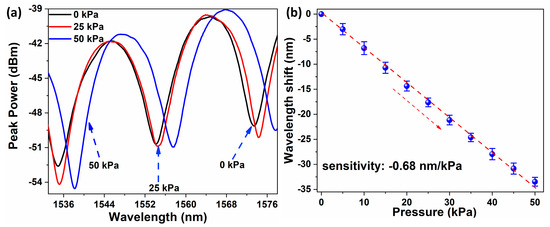 Initially, the pressure response characteristics of the fabricated probe with applied gas pressure was investigated. The pressure in the chamber can be tuned using a pressure controller as shown in Figure 5c and a commercial pressure meter is used to monitor the pressure in the chamber. Figure 6a demonstrates the corresponding interference spectra when the pressure inside the chamber is increased from 0 to 50 KPa with a step size of 5 kPa. A blue shift in the spectral minima is apparent with increasing pressure in the chamber. The experiment was repeated for three cycles and the average response of the probe along with error bars are shown in Figure 6b. A good linearity in the pressure response with an R2 value of 0.998 and a sensitivity of −0.68 nm/kPa were obtained.