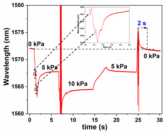 The response time of the FPI sensor to changes in gas pressure was subsequently monitored using an interrogator. The wavelength of a particular spectral minimum was considered to analyze the dynamic response of the sensor. The pressure inside the chamber was increased from standard atmospheric pressure to 5 kPa at which point the pressure was held until the corresponding change in the wavelength of the spectral minimum stabilized. After wavelength stabilization, the pressure was raised again from 5 to 10 kPa. The response of the sensor is shown in Figure 7. The sensor shows a sudden leap in the wavelength for an increase in the gas pressure as can be seen from the inset of Figure 7 where the experimental response time is less than 2 s.