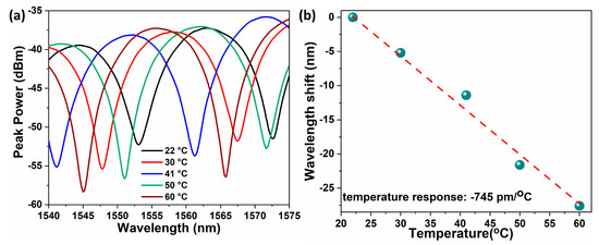 Response of the spectral minima of the FPI sensor to temperature variations (a) and corresponding wavelength shift of a specific spectral minimum (b).
