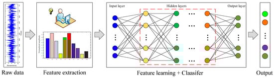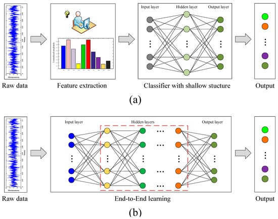 At present, there are two main technical approaches for machine-learning-based bearing failure diagnosis. As shown in Figure 2a, in the traditional machine-learning-based method, feature extraction and fault classification use different algorithms to achieve the purpose of the final fault classification. On the contrary, in the end-to-end deep-learning-based methods, the two processes of feature extraction and classification can be completed at the same time, as shown in Figure 2b.