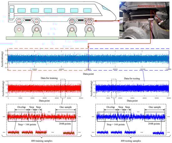 In order to avoid overfitting without sufficient training samples, the data augmentation is essential for improving the generalization and classification accuracy of the CNN. As shown in Figure 5, it is effective to obtain a sufficient number of training samples and testing samples by segmenting overlapping raw data with a specific step length. A vibration signal with 120,000 points can provide 400 training samples and 400 testing samples for the SSIF-CNN when the shift step is 144; the length of each training sample is 2048.
