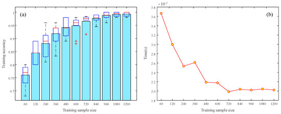 In order to avoid overfitting and enhance the generalization ability of the SSIF-CNN model, a sufficient number of training samples is needed. Figure 6 shows the effect of the training sample size on the SSIF-CNN performance. To verify the stability of the SSIF-CNN, ten training trials were carried out for each training sample size. The mean value and boxplot of the accuracies of the ten training trials are shown in Figure 6a. As the number of training samples increases, the classification accuracy gradually increases. Even if the training sample size is relatively small, the SSIF-CNN can still achieve a high classification accuracy. Figure 6b shows the average time spent on training by the SSIF-CNN with different sizes of training samples. As the number of training samples increases, the average time required for the SSIF-CNN to process one sample gradually decreases. When the sample size exceeds 840, the modified model only needs about 0.02 s to diagnose a sample, which shows that the SSIF-CNN can meet the real-time requirements of fault diagnosis.