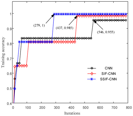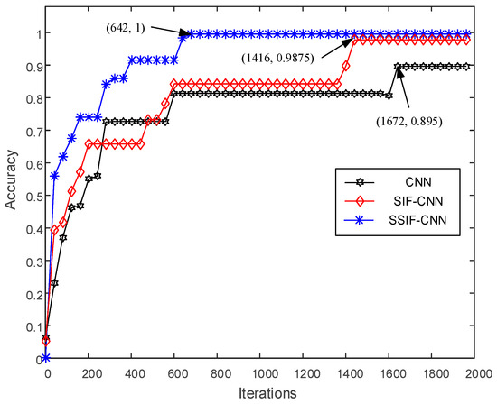 After mixing up the training samples, the whole batch of training samples is input into the training models for ten repeated experiments, and the results of the first trial are shown in Figure 7. As shown in Figure 7, the general CNN will converge after 1672 iterations, with an accuracy at about 89.5%. The accuracy of the SIF-CNN achieves 98.75% after 1416 iterations. However, due to the fewer model parameters, the training accuracy of the SSIF-CNN achieves 100% after only 642 iterations, which is much faster than the general CNN and SIF-CNN.
