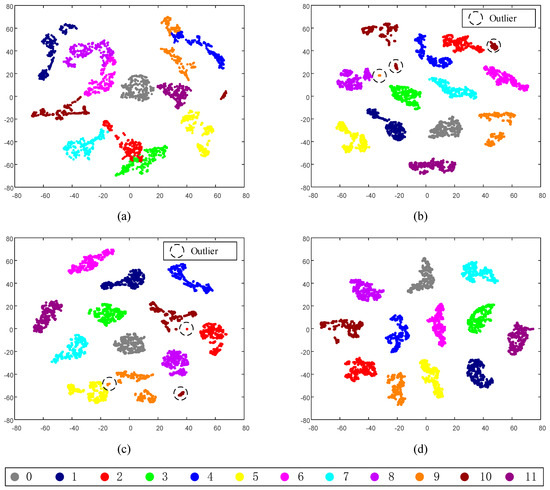 The t-distributed stochastic neighbor embedding [35] (t-SNE) technique is adopted to extract the feature visualizations, and the two-dimensional scatterplot distributions are given in Figure 9. From Figure 9d, the features of different fault types can be clearly classified. The SSIF-CNN can effectively extract features of datasets with different fault categories and different fault depths.