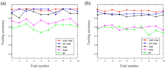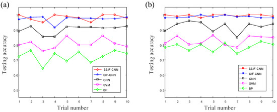 As shown in Figure 10, the training accuracy of the proposed model reaches 100% in six of the ten trials, and the testing accuracy reaches 100% in four of the ten trials. All the accuracies of the proposed model maintain an accuracy level above 95%, which shows that the proposed model has excellent performance not only in high classification accuracy but, also, in classification stability. As illustrated in Table 8, the normal CNN has an average accuracy of training accuracy with 91.8% and test accuracy with 91.6%, and the average training time is about 167.3 s. The average training time of the SIF-CNN is about 192.8 s, the average training accuracy is 99.1% and the average testing accuracy is 98.2%. The average testing accuracy training time of the SSIF-CNN is about 124.2 s, the average training accuracy is 99.5% and the average testing accuracy is 98.6%. The SVM and BPNN have poor classification performances and need more time to complete the model training.