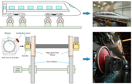 The axle-box bearing fault data is obtained with a train rolling test rig from the National Engineering Laboratory for High-Speed Trains. As shown in Figure 11, the test rig consists of load motors, drive wheels, acceleration sensors, speed sensors and a national instrument (NI) data acquisition system. The load motor drives the driving wheels to rotate, and the high-speed train wheel, as the driven wheel, is driven to simulate the actual working condition of the high-speed train.