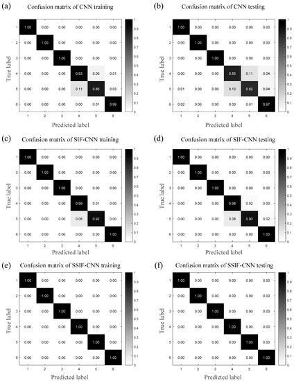Figure 13 shows that the confusion matrix thoroughly records the diagnosis classification results of the different bearing conditions, including both the classification information and misclassification information. As shown in Figure 13a,b, the CNN fails to classify bearing condition 4 and bearing condition 5. The lowest accuracy happens in condition 5 for training and that of testing happens in condition 5, too. It can be seen from Figure 13c,d, in which the lowest accuracy happens in condition 5 for the SIF-CNN training and that of testing happens in condition 5. As shown in Figure 13e,f, the proposed method can classify all the fault types accurately.