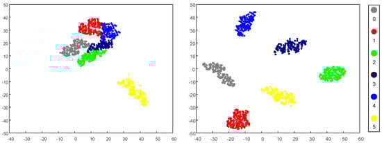 The feature representation of the fully connected layer of the SSIF-CNN is reduced to a two-dimensional distribution by t-SNE. As shown in Figure 14, the features of the different fault types can be clearly classified, which indicates that the SSIF-CNN is an effective approach for high-speed train axle bearing fault classification.