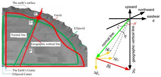 where is the latitude. As shown in Figure 1, the normal gravity direction of any point of the earth follows a normal direction, while the actual gravity direction follows the geographic vertical line. There is a direction deviation μ between the normal gravity and the actual gravity. In a geographic coordinate system, the relationship between the two is as shown in Formula (1)